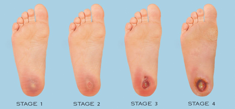 - een moeilijk genezende wonde (dit is reeds een verregaander stadium) dikwijls op een plaats van de voet waar te veel druk is. Soms wordt dit vooraf gegaan door een blaar.